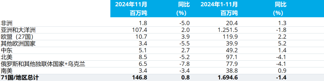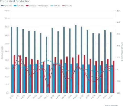 2024年11月全球71個(gè)納入世界鋼鐵協(xié)會(huì)統(tǒng)計(jì)國(guó)家/地區(qū)的粗鋼產(chǎn)量為1.468億噸,同比提高0.8%。