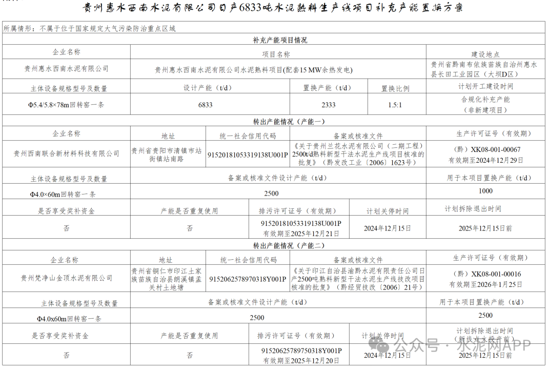 內(nèi)容顯示,貴州惠水西南水泥水泥熟料項(xiàng)目(配套15 MW余熱發(fā)電)設(shè)計(jì)產(chǎn)能6833t/d,補(bǔ)充產(chǎn)能2333t/d,置換比例1.5∶1。