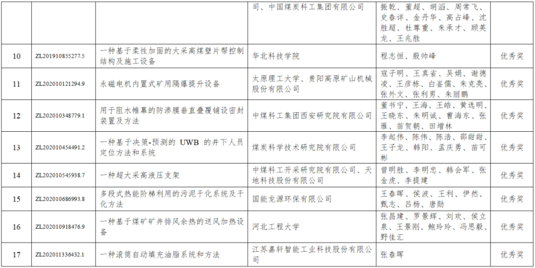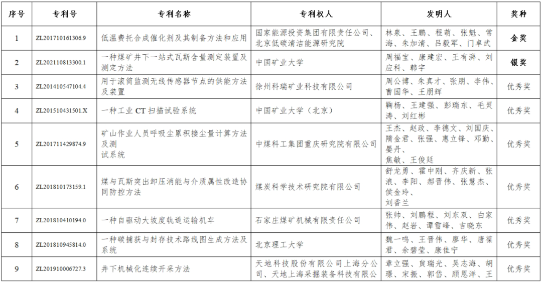 根據(jù)公示情況,煤炭行業(yè)共計(jì)23項(xiàng)專利項(xiàng)目入圍,其中,中國專利金獎1項(xiàng),銀獎1項(xiàng),優(yōu)秀獎20項(xiàng),外觀設(shè)計(jì)優(yōu)秀獎1項(xiàng)。詳細(xì)名單如下: