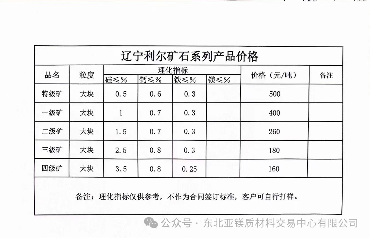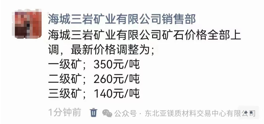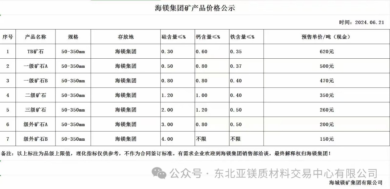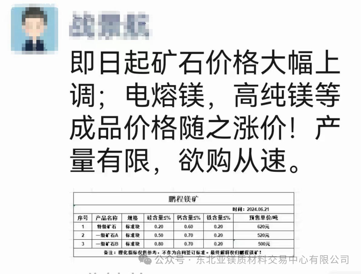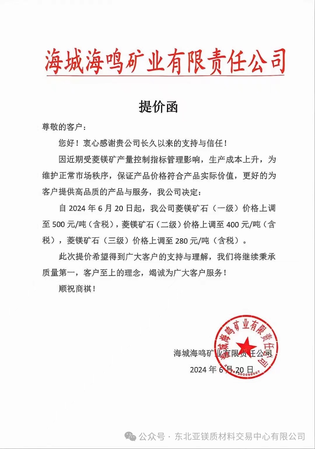 上周,行業(yè)龍頭企業(yè)海鎂集團(tuán)和后英集團(tuán)相繼公示菱鎂礦石新的報(bào)價(jià),從報(bào)價(jià)單可以看出,所有礦石品種的報(bào)價(jià)都有所提高,大企業(yè)帶頭調(diào)價(jià)必然會(huì)有很多企業(yè)跟隨,這也預(yù)示著菱鎂礦石或?qū)⒌搅诵乱惠喌臐q價(jià)潮。不出所料,上周五開始,朋友圈就看到各礦業(yè)公司銷售人員給出了公司菱鎂礦石新報(bào)價(jià)。其中,海鳴礦業(yè)公告自2024年6月20日起,鎂礦石(一級(jí))價(jià)格上調(diào)至 500 元/噸(含稅),菱鎂礦石(二級(jí))價(jià)格上調(diào)至 400元/噸(含稅),菱鎂礦石(三級(jí))價(jià)格上調(diào)至280元/噸(含稅)。