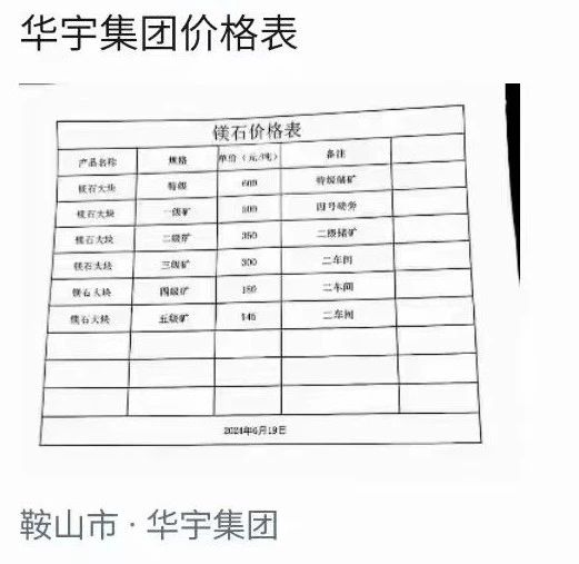 華宇集團(tuán)也給出了鎂石新報(bào)價(jià)。