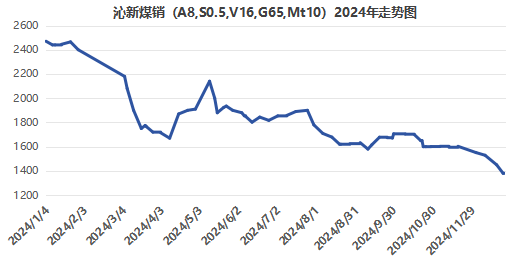 多數(shù)煤種已跌破年內(nèi)新低,其中離柳集團(tuán)高硫主焦公路(A10.5,S3,V25,G85,Y15,MT12)12月25日競拍成交價(jià)1061元/噸,破年內(nèi)新低,較1月底2130元/噸已經(jīng)腰斬;沁新煤銷低硫主焦(A8,S0.5,V16,G65,Mt10)12月25日競拍成交價(jià)1380元/噸,也已破年內(nèi)新低,較1月初2470元/噸也降價(jià)超千元。