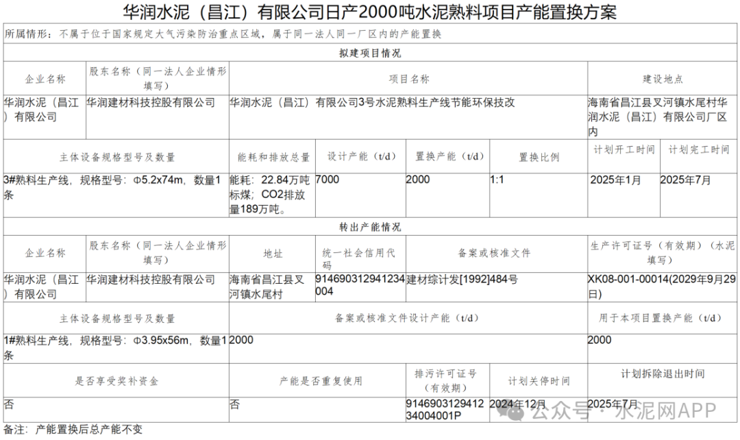 置換方案顯示,華潤水泥(昌江)有限公司3號水泥熟料生產(chǎn)線將進(jìn)行節(jié)能環(huán)保技改,置換產(chǎn)能2000t/d,置換比例1:1。