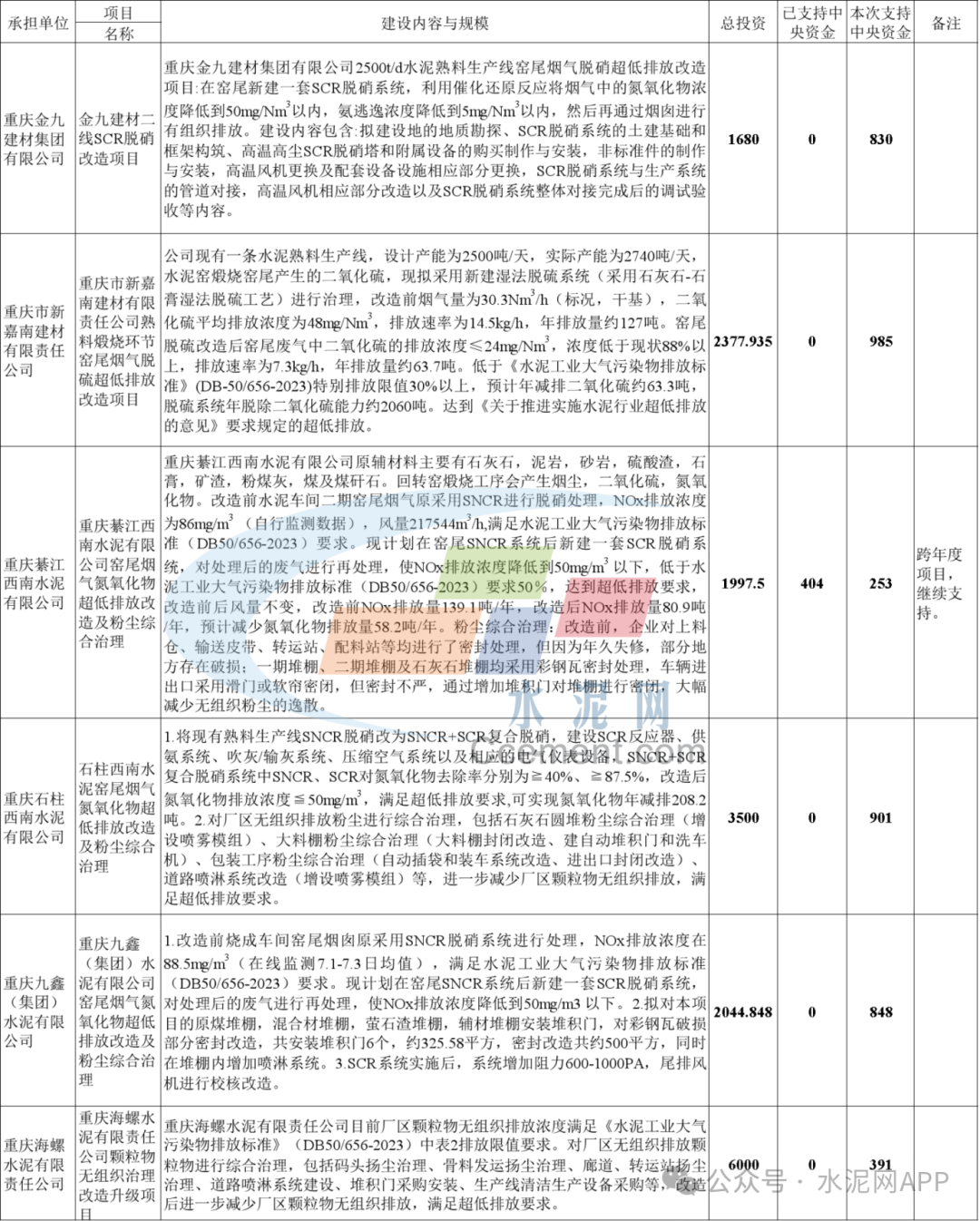其中,重慶金九建材集團有限公司、重慶市新嘉南建材有限責(zé)任公司、重慶綦江西南水泥有限公司、重慶石柱西南水泥有限公司、重慶九鑫(集團)水泥有限公司、重慶海螺水泥有限責(zé)任公司項目獲得資金支持,金額共計4208萬元。中央大氣污染防治資金支持項目表(水泥)單位:萬元