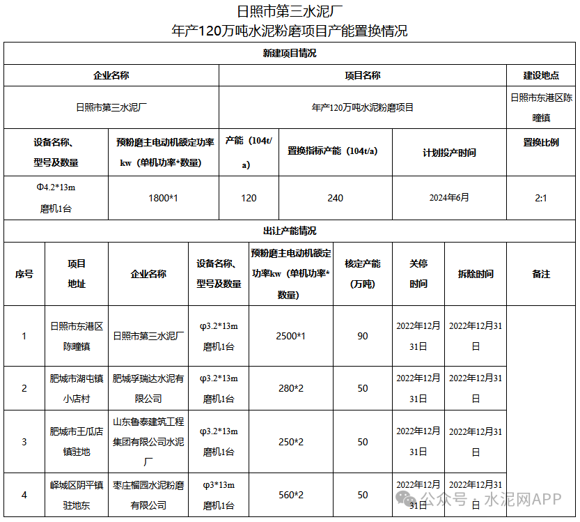 2022年8月8日公告的日照市第三水泥廠年產120萬噸水泥粉磨項目,日照市第三水泥廠決定不再實施,現予以公告。原產能置換情況如下:
