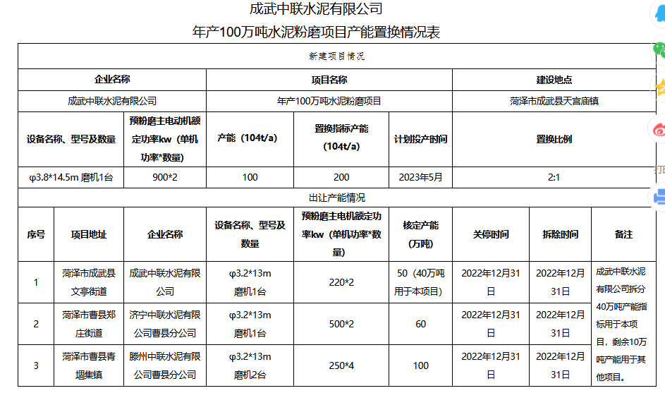 2022年10月19日公告的成武中聯水泥年產100萬噸產線產能置換項目,中聯集團決定不再實施。中聯集團擬將該方案中滕州中聯曹縣分公司100萬噸產能指標,調配用于魯南中聯新建年產130萬噸水泥粉磨項目。