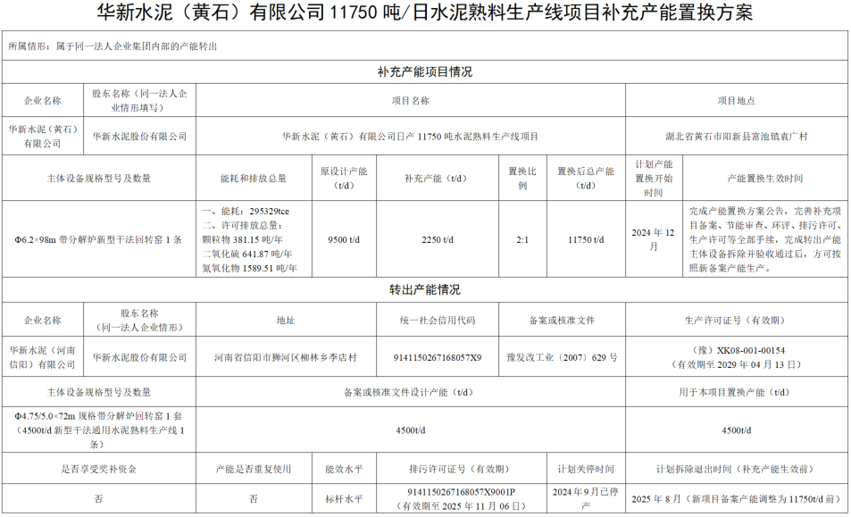 安徽荻港海螺水泥股份有限公司現(xiàn)有1條2000t/d水泥熟料生產(chǎn)線,由于其規(guī)模小、能耗高,擬將該產(chǎn)能置換到同一廠區(qū)內(nèi)2條4500t/d水泥熟料生產(chǎn)線。方案顯示,荻港海螺水泥兩條4500t/d水泥熟料線產(chǎn)能調(diào)整為5500t/d,置換產(chǎn)能1000t/d,置換比例1∶1。退出一條2000t/d熟料線,公告之日起關(guān)停,履行國(guó)有資產(chǎn)處置程序后拆除。