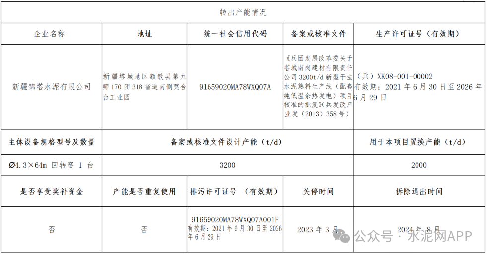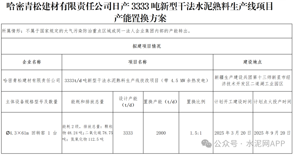 哈密青松建材3333t/d水泥熟料生產(chǎn)線技改項目置換產(chǎn)能2000t/d,出讓產(chǎn)能來自新疆錦塔水泥,置換比例1.5:1。