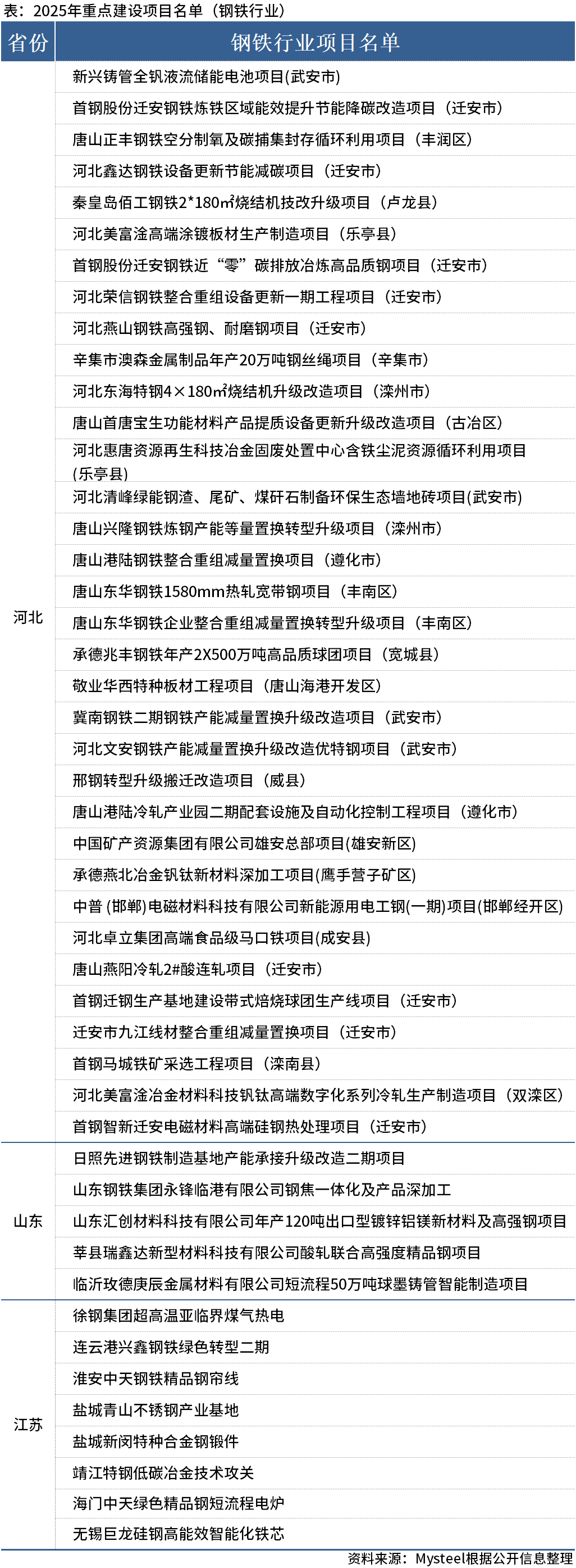 近日,河北、江蘇、 山東發(fā)布2025年重點(diǎn)建設(shè)項(xiàng)目名單,其中,涉及鋼鐵行業(yè)相關(guān)項(xiàng)目47個(gè)。