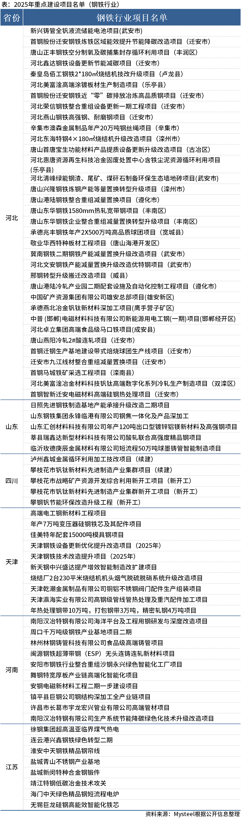近日,河北、江蘇、 山東、天津、河南、四川發(fā)布2025年重點(diǎn)建設(shè)項(xiàng)目名單,其中,涉及鋼鐵行業(yè)相關(guān)項(xiàng)目72個(gè)。