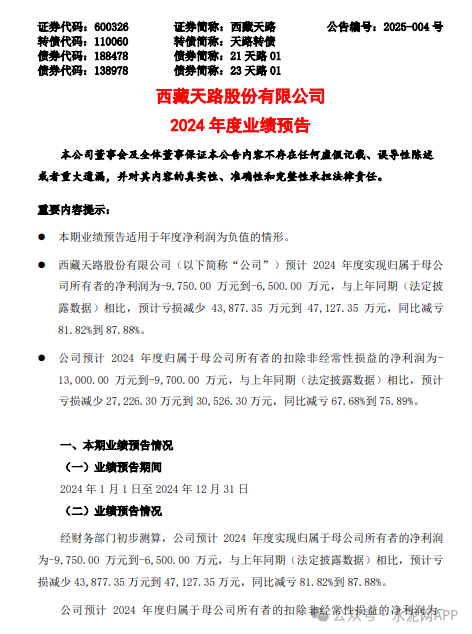 西藏天路1月17日晚間披露2024年度業(yè)績預(yù)告,預(yù)計2024年度實現(xiàn)歸屬于母公司所有者的凈利潤為-9,750.00萬元到-6,500.00萬元,與上年同期(法定披露數(shù)據(jù))相比,預(yù)計虧損減少43,877.35萬元到47,127.35萬元,同比減虧81.82%到87.88%。