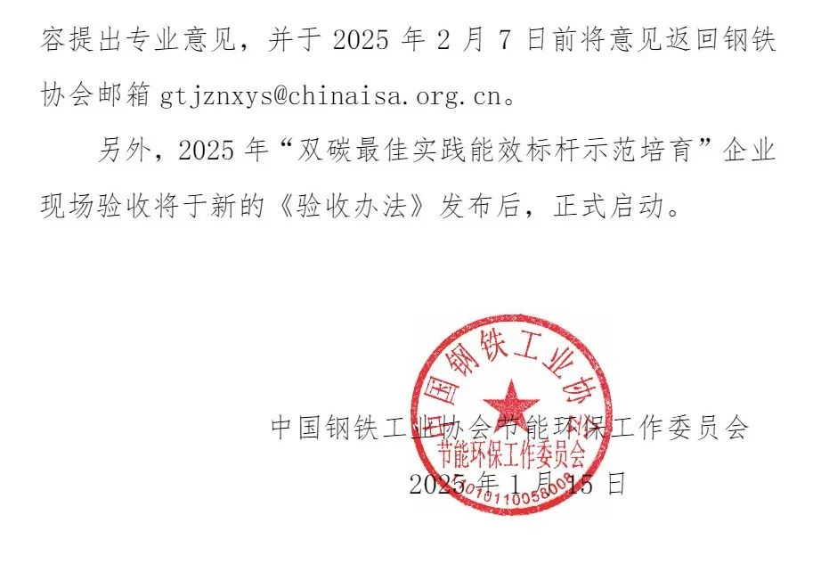 關(guān)于征求《鋼鐵“雙碳最佳實(shí)踐能效標(biāo)桿示范”驗(yàn)收辦法(試行)》修訂意見的函