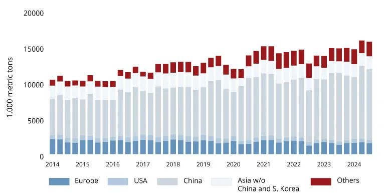 世界不銹鋼協(xié)會(huì)發(fā)布的2024年前三季度的數(shù)據(jù)表明,不銹鋼粗鋼產(chǎn)量4600萬噸,同比增長(zhǎng)5.4%。