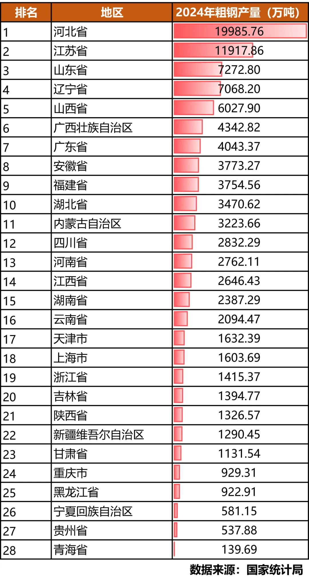 據(jù)國(guó)家統(tǒng)計(jì)局?jǐn)?shù)據(jù),2024年粗鋼產(chǎn)量前10省份依次為河北、江蘇、山東、遼寧、山西、廣西、廣東、安徽、福建、湖北。