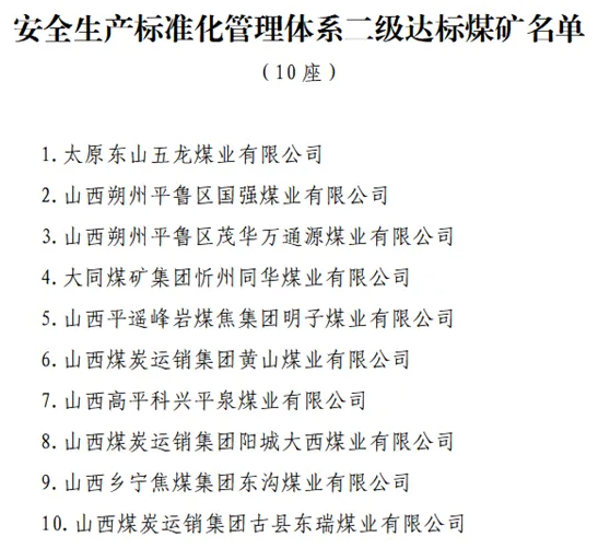 關(guān)于確認(rèn)太原東山五龍煤業(yè)有限公司等10座煤礦為安全生產(chǎn)標(biāo)準(zhǔn)化管理體系二級(jí)達(dá)標(biāo)煤礦的通知