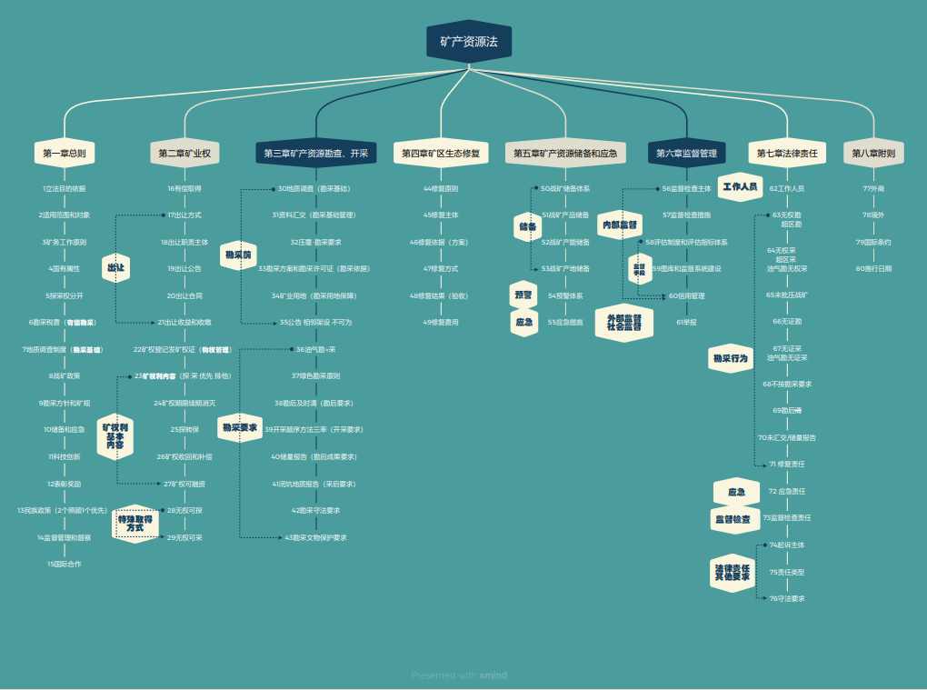近日,廳政策法規(guī)處組織對新《礦產(chǎn)資源法》進行逐條研學(xué),梳理形成了《新礦產(chǎn)資源法學(xué)習(xí)摘要》,以思維導(dǎo)圖形式呈現(xiàn)新礦法的脈絡(luò)和框架,便于礦業(yè)工作人員按圖索驥,高效掌握新《礦產(chǎn)資源法》的主要內(nèi)容。下一步,遼寧省自然資源廳將通過廳網(wǎng)站、廳微信公眾號陸續(xù)開展條文內(nèi)容研學(xué),在全省自然資源系統(tǒng)掀起學(xué)習(xí)新礦法熱潮,為全省礦業(yè)高質(zhì)量發(fā)展提供法治保障。