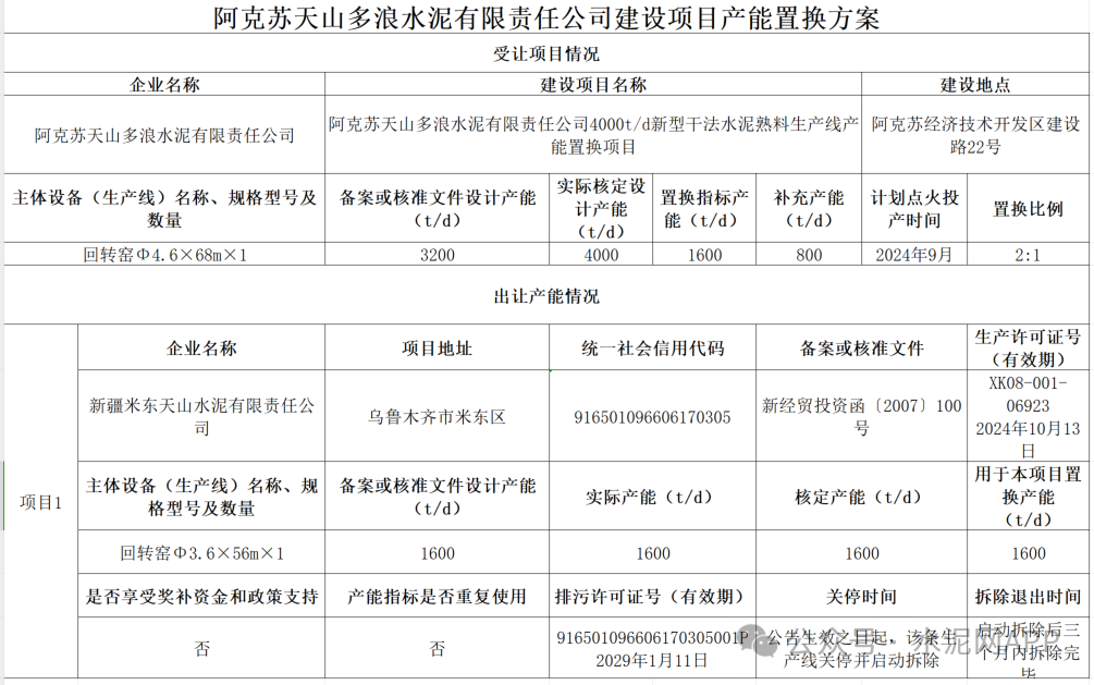 經(jīng)現(xiàn)場核查確認(rèn),新疆米東天山水泥有限責(zé)任公司2024年8月置換至阿克蘇天山多浪有限責(zé)任公司的Φ3.6×56米(日產(chǎn)1600噸)水泥熟料生產(chǎn)線已關(guān)停拆除。