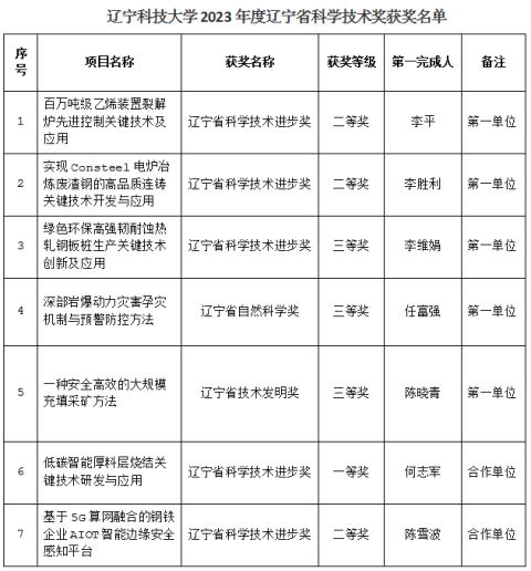 近日,省政府公布《遼寧省人民政府關(guān)于2023年度遼寧省科學(xué)技術(shù)獎勵的決定》,遼寧科技大學(xué)作為第一單位共有5項成果獲獎,其中科學(xué)技術(shù)進步獎二等獎2項、科學(xué)技術(shù)進步獎三等獎1項、自然科學(xué)獎三等獎1項、技術(shù)發(fā)明獎三等獎1項,作為合作單位獲科學(xué)技術(shù)進步獎一等獎、二等獎各1項,獲獎數(shù)量位居省屬高校前列。