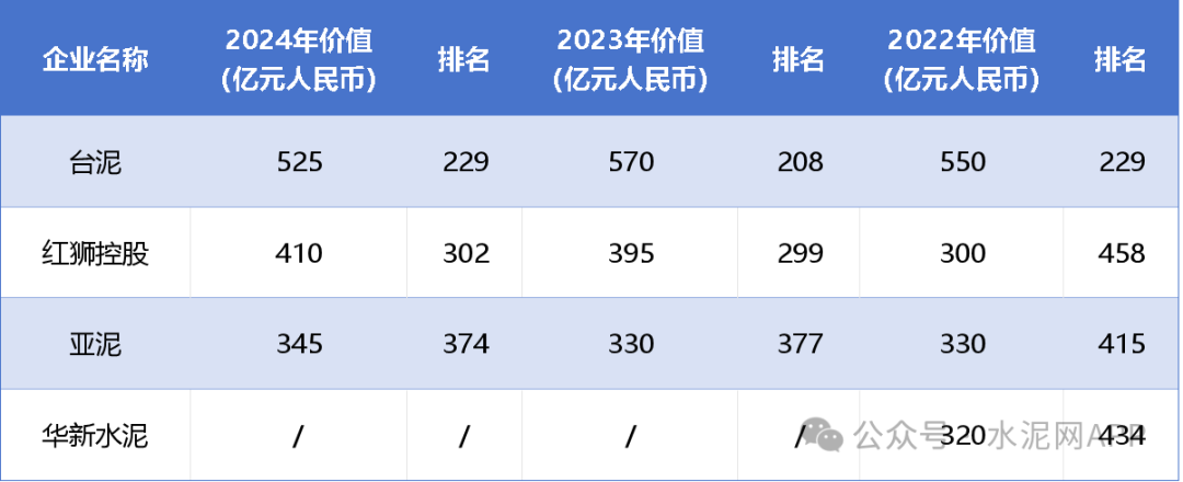 2月25日,胡潤研究院發(fā)布《2024胡潤中國500強(qiáng)》榜單,列出了中國500強(qiáng)非國有企業(yè),按照企業(yè)價值進(jìn)行排名。這是胡潤研究院連續(xù)第六次發(fā)布“胡潤中國500強(qiáng)”。 其中水泥行業(yè):臺灣水泥排名第229位;紅獅控股排名第302位;亞洲水泥排名第374位。