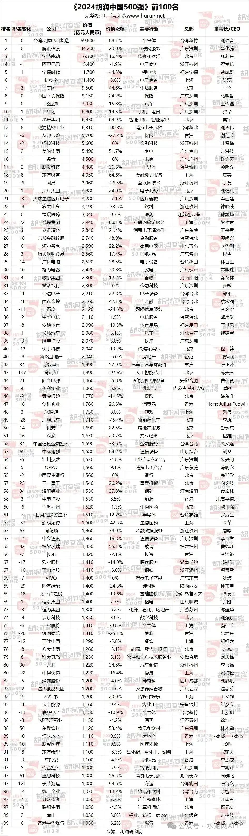 胡潤研究院發(fā)布《2024胡潤中國500強(qiáng)》(Hurun China 500 Most Valuable Private Companies 2024),列出了中國500強(qiáng)非國有企業(yè),按照企業(yè)價值進(jìn)行排名。上市公司市值按照2024年11月15日的收盤價計(jì)算,非上市公司估值參考同行業(yè)上市公司或根據(jù)最新一輪融資情況進(jìn)行估算。