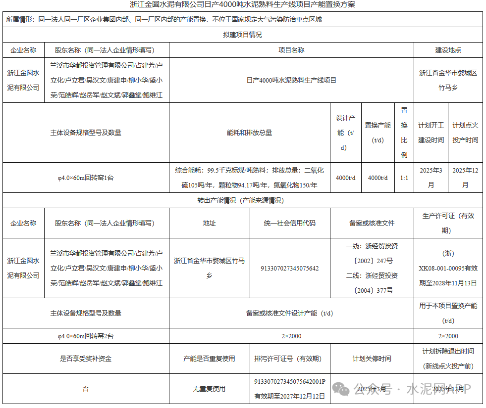 置換方案顯示,金圓水泥擬建4000t/d熟料生產(chǎn)線項(xiàng)目,出讓產(chǎn)能來自同公司2*2000t/d熟料生產(chǎn)線,置換比例1:1。項(xiàng)目計(jì)劃開工時(shí)間2025年3月,計(jì)劃點(diǎn)火時(shí)間2025年12月。