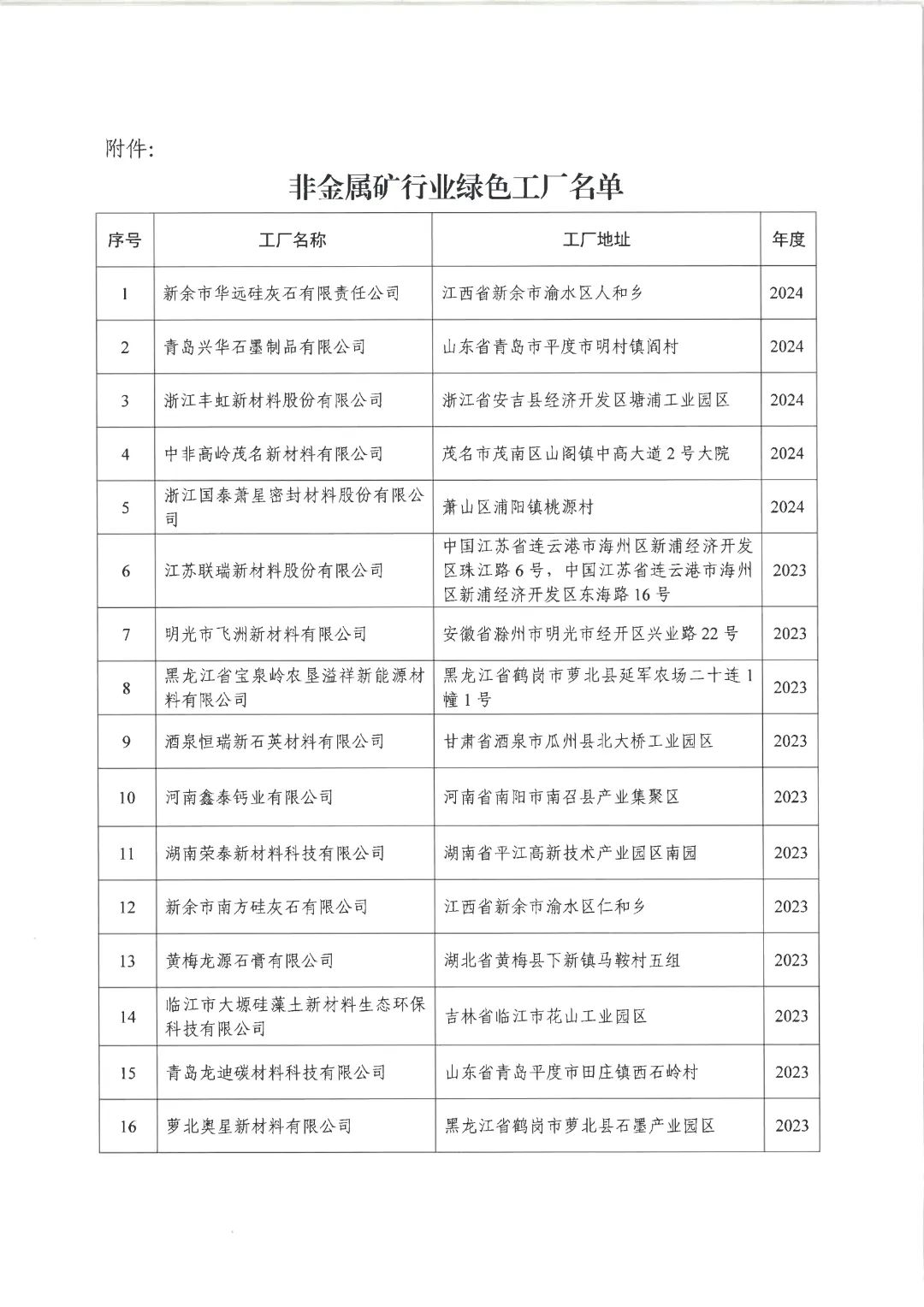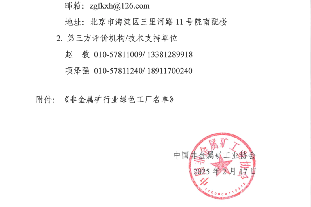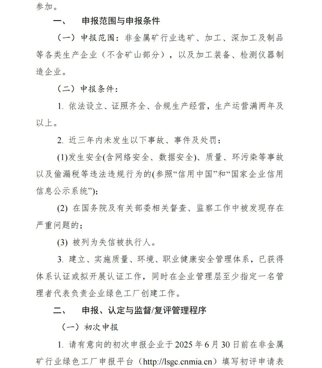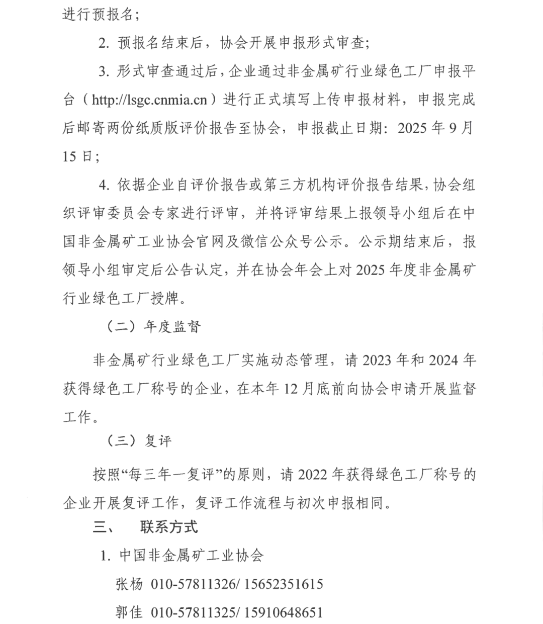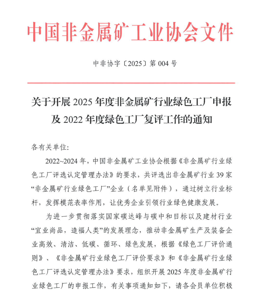 關(guān)于開展2025年度非金屬礦行業(yè)綠色工廠申報(bào)及2022年度綠色工廠復(fù)評(píng)工作的通知?
