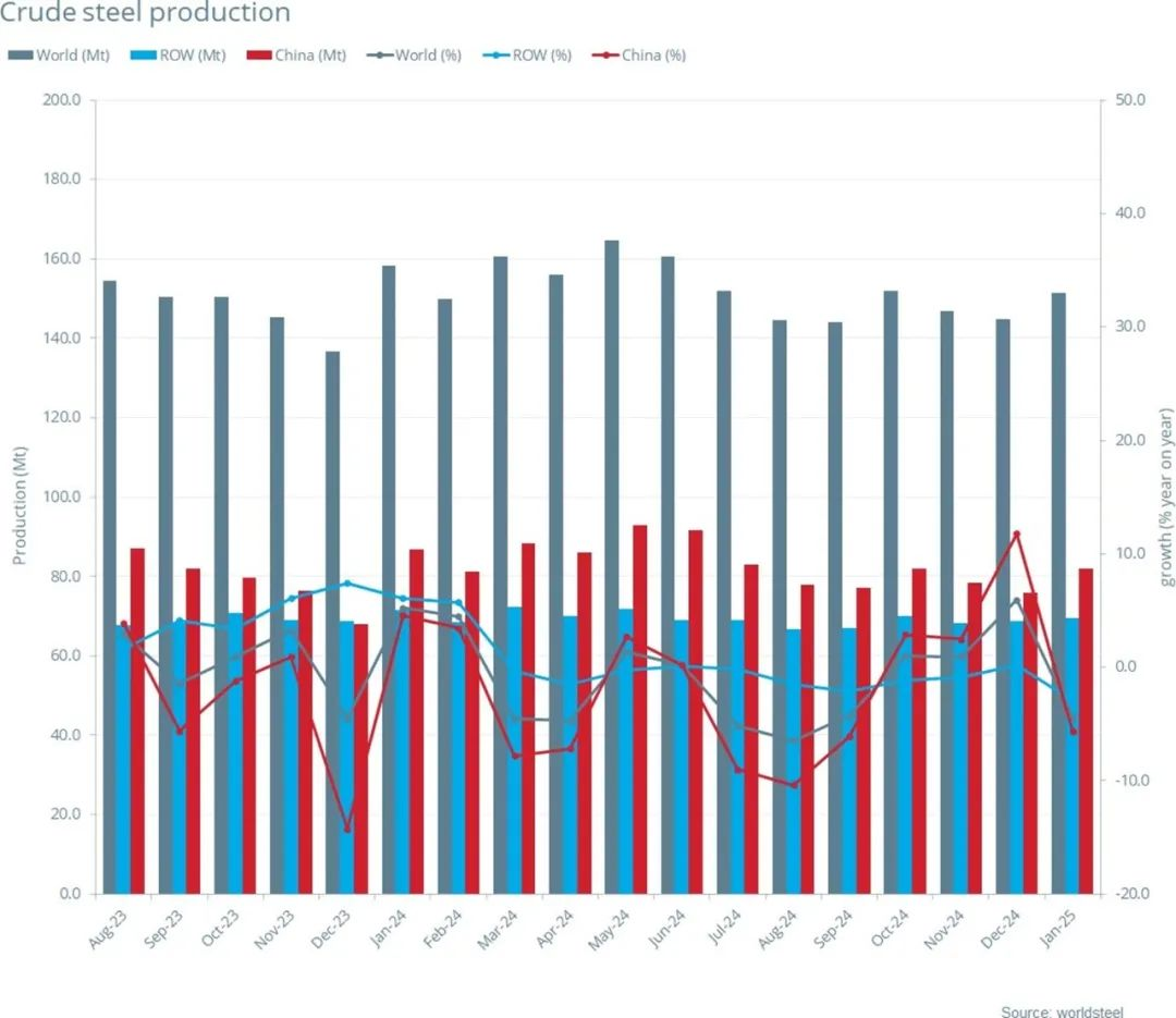 2025年1月,全球69個納入世界鋼鐵協(xié)會統(tǒng)計國家/地區(qū)的粗鋼產量為1.514億噸,同比下降4.4%。