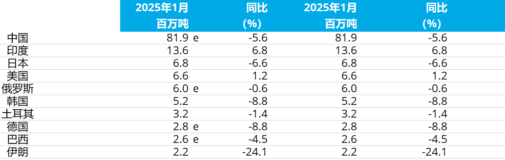 2025年1月全球粗鋼產量