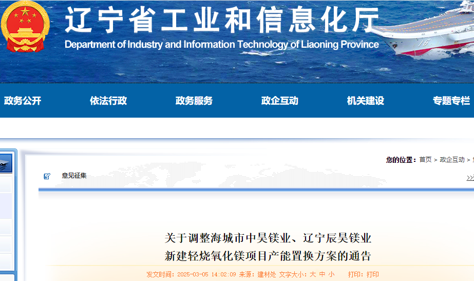 按照《遼寧省人民政府辦公廳關(guān)于推進(jìn)菱鎂行業(yè)高質(zhì)量發(fā)展的實(shí)施意見》(遼政辦發(fā)〔2023〕15號(hào))、《遼寧省菱鎂礦浮選及鎂砂行業(yè)產(chǎn)能置換辦法》(遼工信建材〔2024〕18號(hào))要求,根據(jù)企業(yè)申請、鞍山市初審和申請,因建設(shè)內(nèi)容、建設(shè)地點(diǎn)等項(xiàng)目內(nèi)容變更,對(duì)海城市中昊鎂業(yè)有限公司、遼寧辰昊鎂業(yè)有限公司新建輕燒氧化鎂項(xiàng)目產(chǎn)能置換方案進(jìn)行調(diào)整,現(xiàn)對(duì)調(diào)整后的產(chǎn)能置換方案重新予以通告。