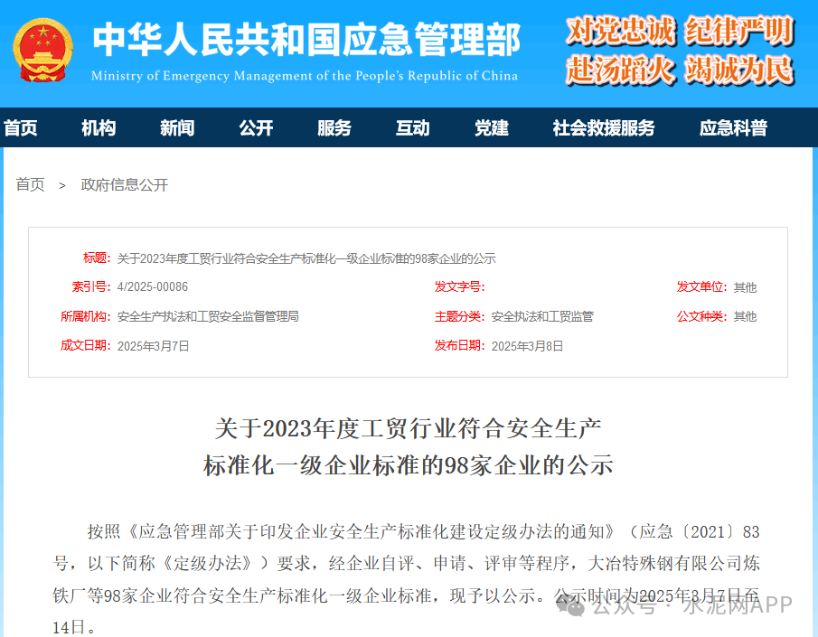 近日,國家應急管理部發(fā)布關于2023年度工貿(mào)行業(yè)符合安全生產(chǎn)標準化一級企業(yè)標準的98家企業(yè)的公示。
