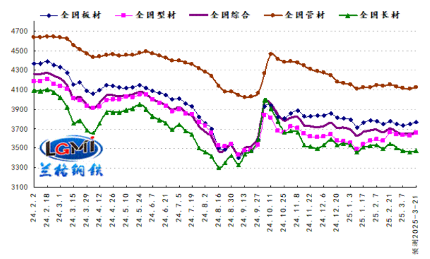 2025年第11周(2025.3.10-3.14)蘭格鋼鐵全國絕對(duì)價(jià)格指數(shù)為3645元,較上周下降0.1%,較去年同期下降9.6%;其中,蘭格鋼鐵長材絕對(duì)價(jià)格指數(shù)為3457元,較上周下降0.4%,較去年同期下降8.6%;蘭格鋼鐵型材絕對(duì)價(jià)格指數(shù)為3627元,較上周下降0.1%,較去年同期下降10.3%;蘭格鋼鐵板材絕對(duì)價(jià)格指數(shù)為3746元,較上周上升0.3%,較去年同期下降10.3%;蘭格鋼鐵管材絕對(duì)價(jià)格指數(shù)為4107元,較上周下降0.3%,較去年同期下降10.1%。