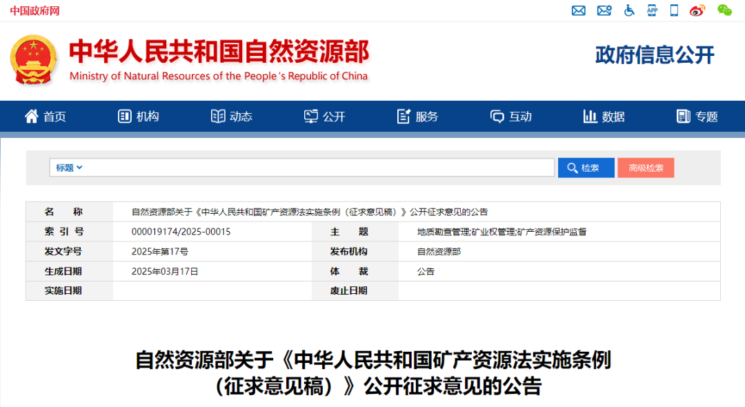 為貫徹落實(shí)黨中央、國務(wù)院關(guān)于深化礦產(chǎn)資源管理制度改革的決策部署,進(jìn)一步健全完善以《礦產(chǎn)資源法》為核心的礦產(chǎn)資源法律法規(guī)體系,自然資源部起草了《中華人民共和國礦產(chǎn)資源法實(shí)施條例(征求意見稿)》。為了增強(qiáng)立法的公開性和透明度,提高立法質(zhì)量,現(xiàn)將《中華人民共和國礦產(chǎn)資源法實(shí)施條例(征求意見稿)》及其說明公布,征求社會(huì)各界意見。公眾可以登錄自然資源部門戶網(wǎng)站(http://www.mnr.gov.cn)查閱征求意見稿及其說明。有關(guān)意見建議可以在2025年4月15日前通過電子郵件方式發(fā)送至:fgzqyj@mail.mnr.gov.cn。