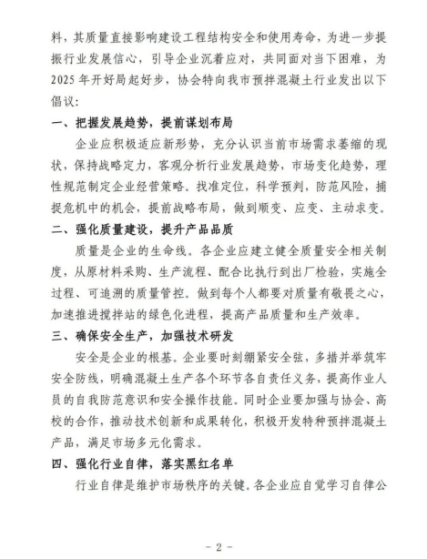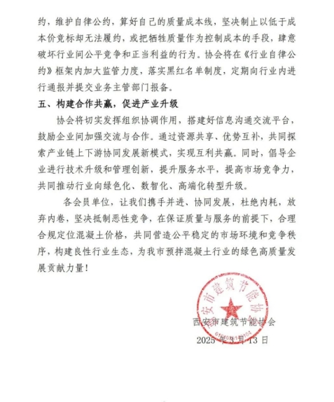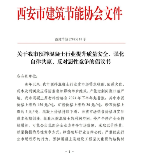 去年以來,西安市預(yù)拌混凝土行業(yè)受市場需求收縮、回款欠佳、成本及利潤承壓等因素疊加影響舉步維艱,產(chǎn)能過剩問題日益嚴(yán)峻。西安市混凝土原材料價格自2024年下半年起普漲,其中水泥價格上漲約150元/噸,礦粉價格上漲約20元/噸,砂石價格上漲約5元/噸,混凝土價格持續(xù)下滑,當(dāng)前市場銷售價格與實際成本長期倒掛,極致壓縮混凝土的利潤空間,停產(chǎn)半停產(chǎn)企業(yè)持續(xù)增加,可能會出現(xiàn)部分企業(yè)為爭奪市場份額,采取以價換量、以量換損的惡性競爭方式,肆意破壞行業(yè)自律公約,嚴(yán)重擾亂行業(yè)市場秩序的行為。