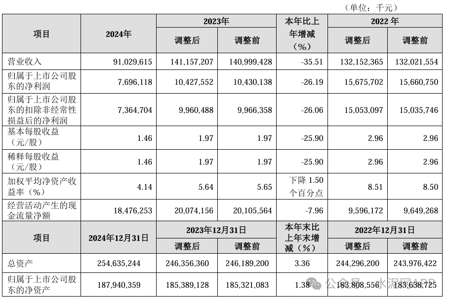 3月24日,海螺水泥公告稱,2024年實現(xiàn)營業(yè)收入910.3億元,同比下降35.51%;歸屬于上市公司股東的凈利潤為76.96億元,同比下降26.19%。公司擬每股派發(fā)現(xiàn)金紅利0.71元人民幣(含稅),不實施公積金轉(zhuǎn)增股本。報告期內(nèi),本集團增加熟料產(chǎn)能230萬噸(海外),通過遷建等方式新增水泥產(chǎn)能800萬噸,新增骨料產(chǎn)能1,450萬噸、商品混凝土產(chǎn)能1,210萬立方米、光儲發(fā)電裝機容量103兆瓦。截至報告期末,本集團擁有熟料產(chǎn)能2.74億噸,水泥產(chǎn)能4.03億噸,骨料產(chǎn)能1.63億噸,在運行商品混凝土產(chǎn)能5,190萬立方米,在運行光儲發(fā)電裝機容量645兆瓦。