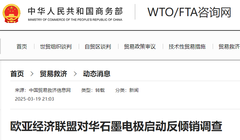 2025年2月28日,歐亞經(jīng)濟(jì)委員會內(nèi)部市場保護(hù)司發(fā)布第2025/431/AD40號公告稱,應(yīng)歐亞經(jīng)濟(jì)聯(lián)盟企業(yè)申請,依據(jù)2025年2月24日第1號令,對原產(chǎn)于中國的石墨電極(俄語:отношении графитированныхэлектродов диаметром более 520 мм, но не более 650 мм)啟動反傾銷調(diào)查。涉案產(chǎn)品為爐用,橫截面直徑介于520~650毫米(含)的圓形橫截面石墨電極,以及橫截面面積介于2700~3300平方厘米(含)的其他橫截面石墨電極;涉案產(chǎn)品的歐亞經(jīng)濟(jì)聯(lián)盟稅號為8545110020。
