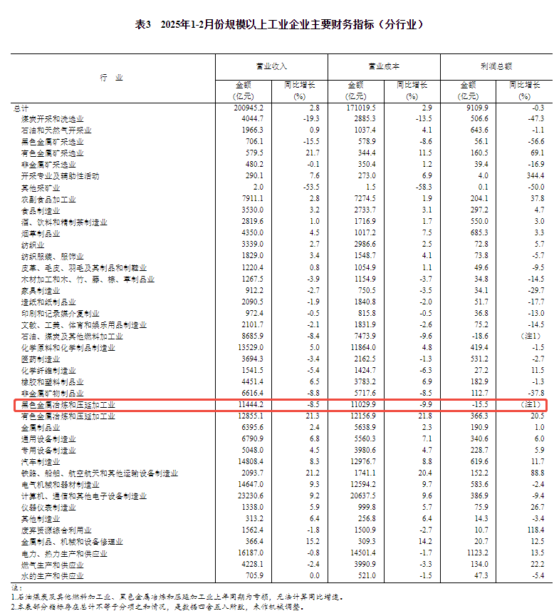 2025年1-2月份,全國規(guī)模以上工業(yè)企業(yè)實現(xiàn)利潤總額9109.9億元,同比下降0.3%。1-2月份,規(guī)模以上工業(yè)企業(yè)中,國有控股企業(yè)實現(xiàn)利潤總額3487.7億元,同比增長2.1%;股份制企業(yè)實現(xiàn)利潤總額6739.2億元,下降2.0%;外商及港澳臺投資企業(yè)實現(xiàn)利潤總額2304.6億元,增長4.9%;私營企業(yè)實現(xiàn)利潤總額2209.9億元,下降9.0%。1-2月份,采礦業(yè)實現(xiàn)利潤總額1410.3億元,同比下降25.2%;制造業(yè)實現(xiàn)利潤總額6395.1億元,增長4.8%;電力、熱力、燃?xì)饧八a(chǎn)和供應(yīng)業(yè)實現(xiàn)利潤總額1304.5億元,增長13.5%。1-2月份,主要行業(yè)利潤情況如下:農(nóng)副食品加工業(yè)利潤同比增長37.8%,有色金屬冶煉和壓延加工業(yè)增長20.5%,電力、熱力生產(chǎn)和供應(yīng)業(yè)增長13.5%,汽車制造業(yè)增長11.7%,通用設(shè)備制造業(yè)增長6.0%,專用設(shè)備制造業(yè)增長5.9%,紡織業(yè)增長5.7%,石油和天然氣開采業(yè)下降1.1%,化學(xué)原料和化學(xué)制品制造業(yè)下降1.5%,電氣機(jī)械和器材制造業(yè)下降2.4%,計算機(jī)、通信和其他電子設(shè)備制造業(yè)下降9.4%,非金屬礦物制品業(yè)下降37.8%,煤炭開采和洗選業(yè)下降47.3%,石油煤炭及其他燃料加工業(yè)、黑色金屬冶煉和壓延加工業(yè)同比減虧。2025年1-2月份,黑色金屬冶煉和壓延加工業(yè)利潤總額-15.5億元(同比去年,2024年1-2月份,黑色金屬冶煉和壓延加工業(yè)利潤總額虧損146.1億元)。