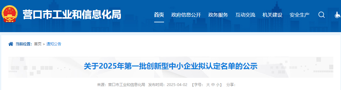 按省工信廳《關于做好2025年度創(chuàng)新型中小企業(yè)申報工作的通知》要求,經(jīng)企業(yè)登錄優(yōu)質(zhì)中小企業(yè)梯度培育平臺自愿申報,各縣(市)區(qū)、園區(qū)工信主管部門推薦,市工信局初審,擬認定營口盛和耐材制造有限公司等10家企業(yè)為2025年第一批創(chuàng)新型中小企業(yè),現(xiàn)將通過名單予以公示。任何單位或個人對公示有異議的,可在公示期內(nèi)與市工信局聯(lián)系。
