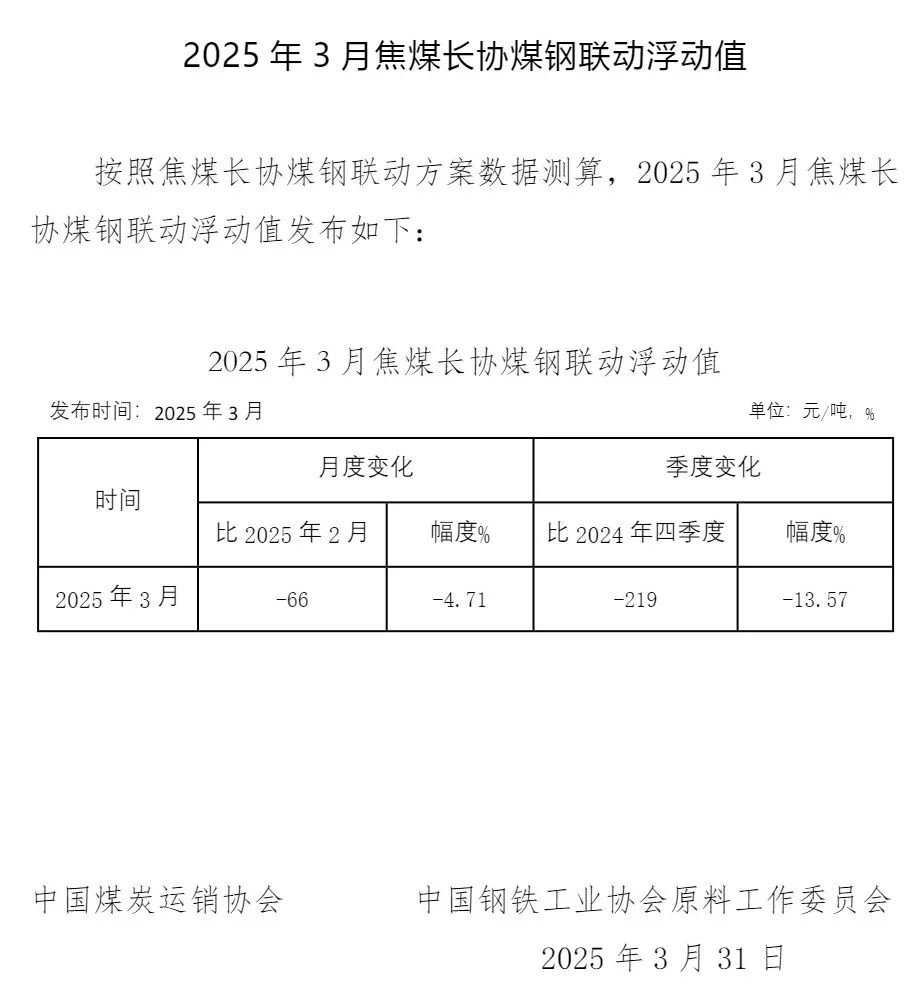 2025年3月焦煤長(zhǎng)協(xié)煤鋼聯(lián)動(dòng)浮動(dòng)值