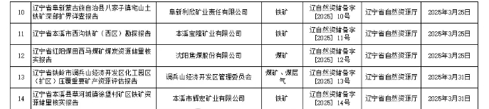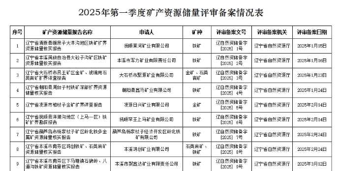 遼寧省2025年第一季度礦產(chǎn)資源儲量評審備案情況表