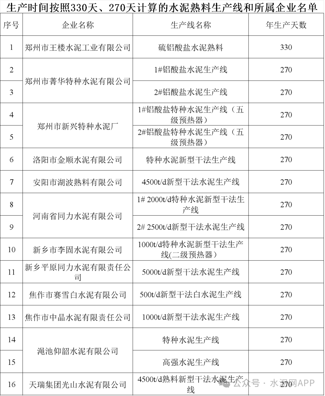 內(nèi)容顯示,鄭州市王樓水泥工業(yè)有限公司年生產(chǎn)天數(shù)按330天計(jì)算,鄭州市菁華特種水泥有限公司等11家企業(yè)15條生產(chǎn)線年生產(chǎn)天數(shù)按270天計(jì)算。