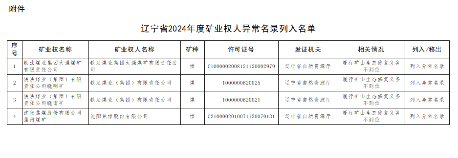 按照《礦業(yè)權(quán)人勘查開(kāi)采信息管理辦法》(自然資源部令第13號(hào))《自然資源部辦公廳關(guān)于做好2024年礦業(yè)權(quán)人勘查開(kāi)采信息公示工作的通知》(自然資辦函〔2024〕213號(hào))等要求,我省開(kāi)展了礦業(yè)權(quán)人信息管理實(shí)地核查工作。根據(jù)核查結(jié)果,對(duì)擬列入異常名錄的名單進(jìn)行了公示?,F(xiàn)決定將鐵法煤業(yè)集團(tuán)大強(qiáng)煤礦有限責(zé)任公司等4個(gè)礦業(yè)權(quán)列入異常名錄(詳細(xì)名單見(jiàn)附件)。