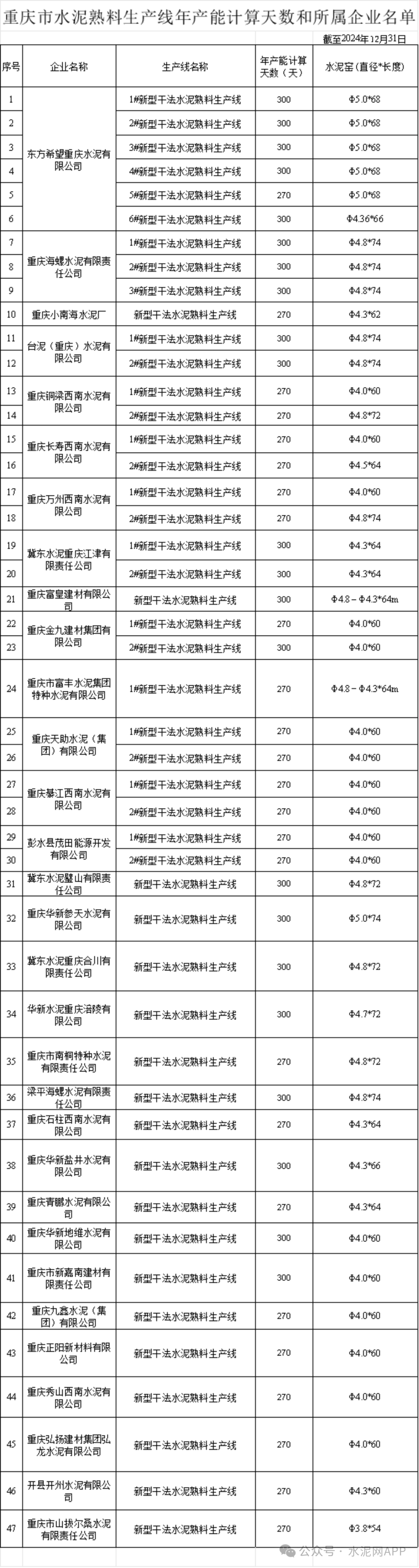 4月24日,重慶市經濟和信息化委員會發(fā)布關于重慶市水泥熟料生產線年產能計算天數(shù)和所屬企業(yè)名單的公示。
