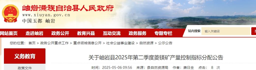 根據(jù)鞍山市菱鎂產(chǎn)業(yè)發(fā)展工作專班《關(guān)于下達(dá)鞍山市2025年第2季度菱鎂礦產(chǎn)量控制指標(biāo)的通知》(鞍鎂專班〔2025〕2號),現(xiàn)對岫巖縣2025年第二季度菱鎂礦產(chǎn)量控制指標(biāo)分配情況予以公告。