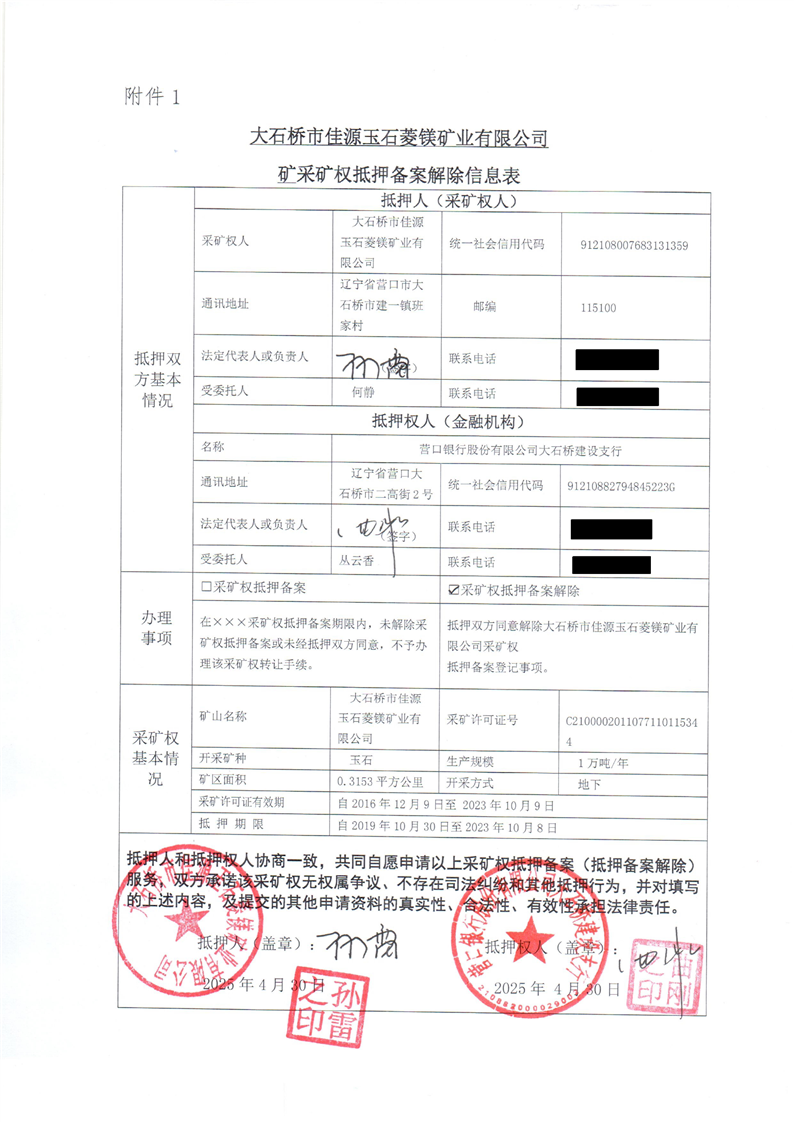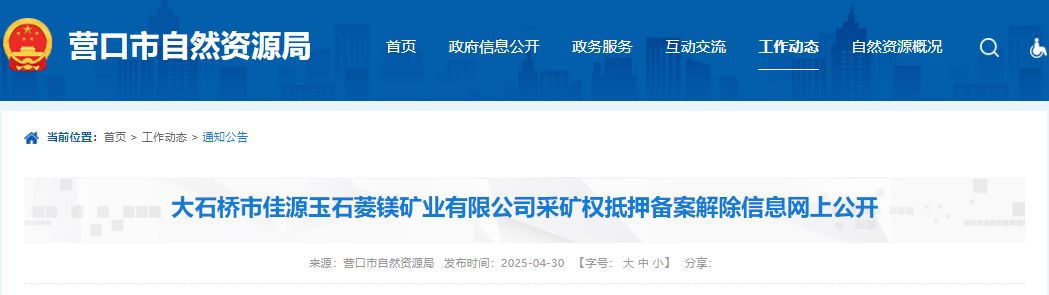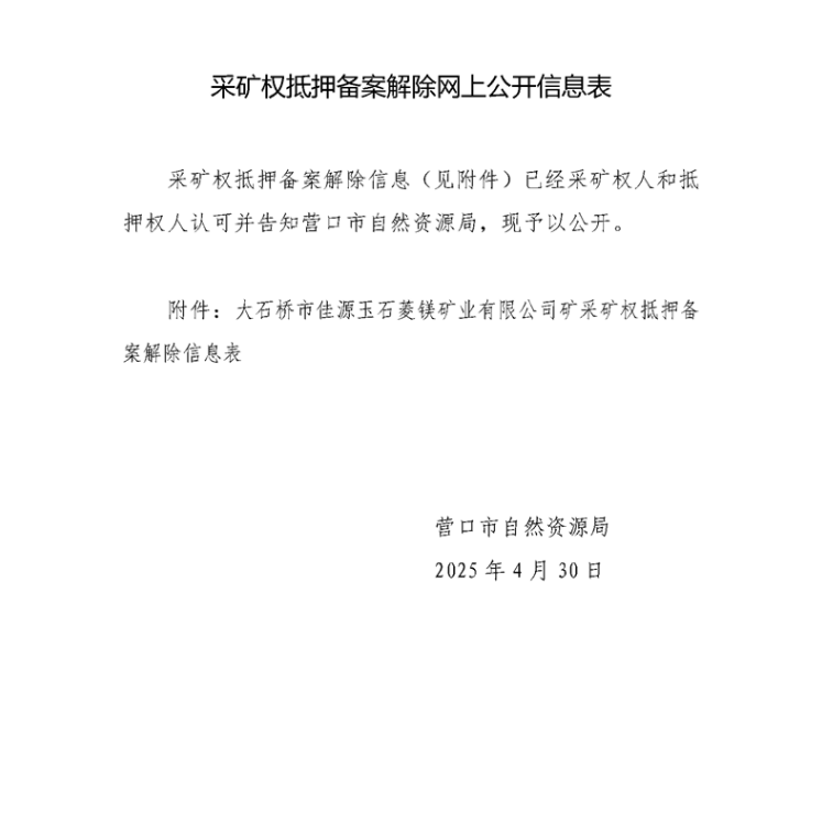 大石橋市佳源玉石菱鎂礦業(yè)有限公司采礦權(quán)抵押備案解除信息網(wǎng)上公開