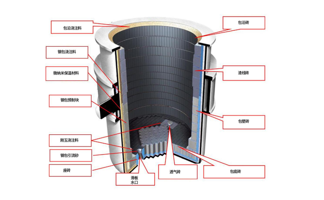 首先,鋼包用來運輸高溫鋼水。在運輸過程中,1680℃左右的高溫鋼水和熔渣對其進行沖刷侵蝕,尤其是渣線部位,沖刷侵蝕比較嚴重,是決定一個罐使用壽命的重要因素。