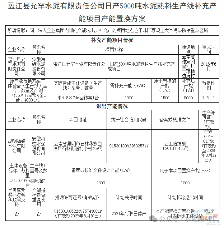 置換方案顯示,海螺水泥子公司盈江縣允罕水泥5000t/d熟料生產(chǎn)線項目補充1000t/d產(chǎn)能,置換比例1.5:1。退出的1500t/d產(chǎn)能來自昆明海螺水泥2500t/d熟料線。