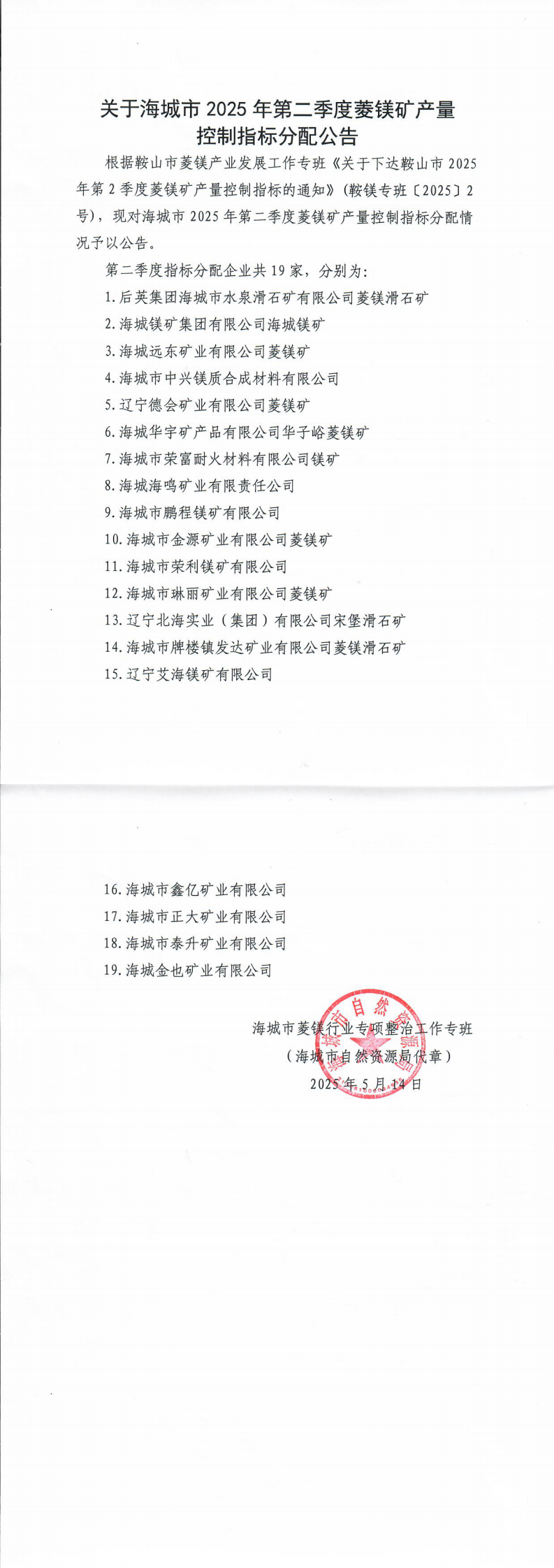 關(guān)于海城市2025年第二季度菱鎂礦產(chǎn)量控制指標(biāo)分配公告