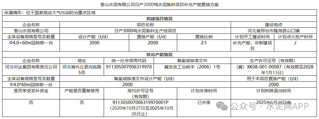 根據(jù)公示,奎山水泥日產(chǎn)3000噸水泥熟料生產(chǎn)線項(xiàng)目原生產(chǎn)線備案產(chǎn)能2000t/d,補(bǔ)充產(chǎn)能后為3000t/d,置換比例為2:1。河北中達(dá)集團(tuán)有限責(zé)任公司2000t/d熟料線用于本項(xiàng)目置換產(chǎn)能,計(jì)劃2025年6月30日前拆除退出。