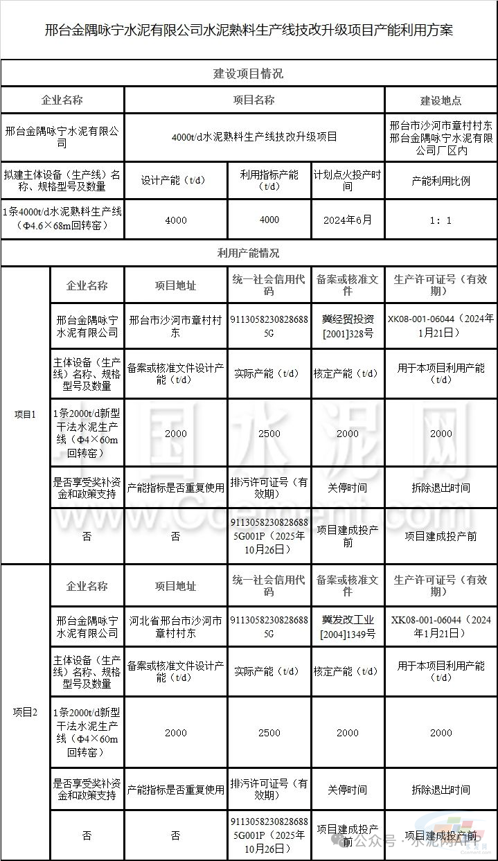2022年2月15日,邢臺(tái)金隅詠寧水泥有限公司水泥熟料生產(chǎn)線技術(shù)改造項(xiàng)目產(chǎn)能利用方案在我廳門戶網(wǎng)站進(jìn)行公告。因企業(yè)發(fā)展戰(zhàn)略調(diào)整,邢臺(tái)金隅詠寧水泥有限公司申請(qǐng)撤銷該產(chǎn)能利用方案。按照《水泥玻璃行業(yè)產(chǎn)能置換實(shí)施辦法(2024年本)》(工信部原〔2024〕206號(hào))要求,經(jīng)研究,現(xiàn)將邢臺(tái)金隅詠寧水泥有限公司水泥熟料生產(chǎn)線技術(shù)改造項(xiàng)目產(chǎn)能利用方案予以撤銷,歡迎社會(huì)公眾進(jìn)行監(jiān)督。據(jù)了解,該項(xiàng)目原計(jì)劃建設(shè)4000t/d熟料生產(chǎn)線,拆除退出現(xiàn)有2條水泥熟料生產(chǎn)線回轉(zhuǎn)窯全部。產(chǎn)能置換方案見(jiàn)下: