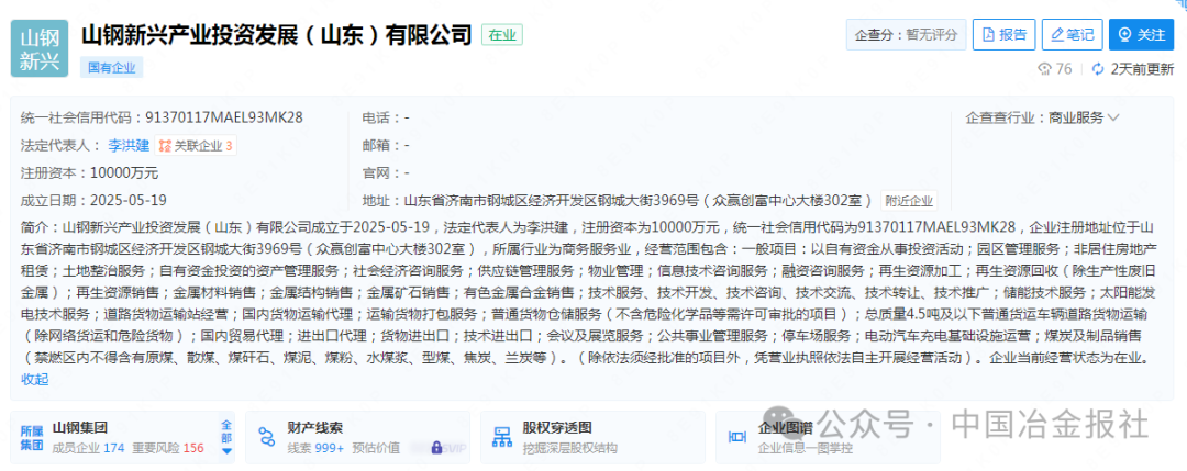 據(jù)企查查信息顯示,山鋼新興產(chǎn)業(yè)投資發(fā)展(山東)有限公司于5月19日成立。法定代表人為李洪建,注冊(cè)資本為10000萬(wàn)元,所屬行業(yè)為商務(wù)服務(wù)業(yè)。具體情況如下圖:
